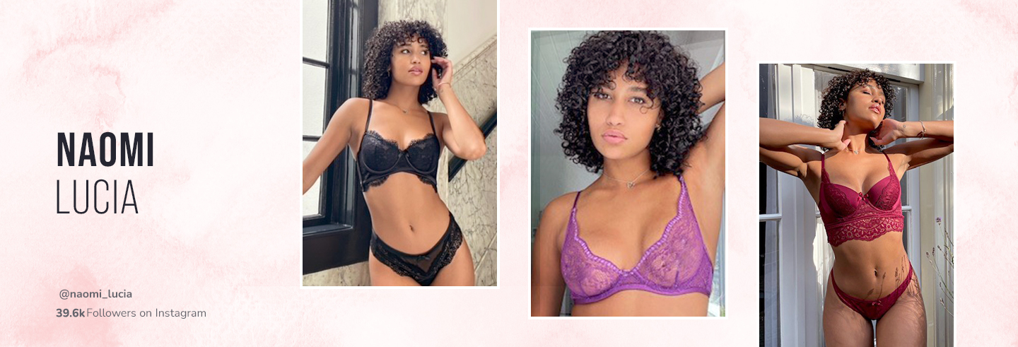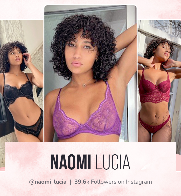Naomi loves a beautiful balcony bra with some playful lace details. Color wise she loves to POP, however you can always find a beautiful black lace set in her closet.