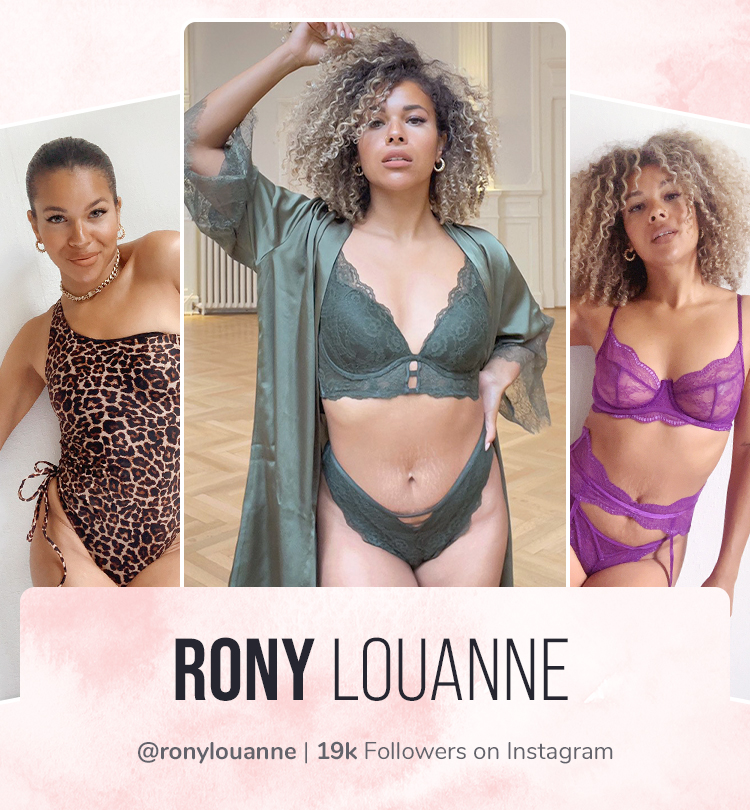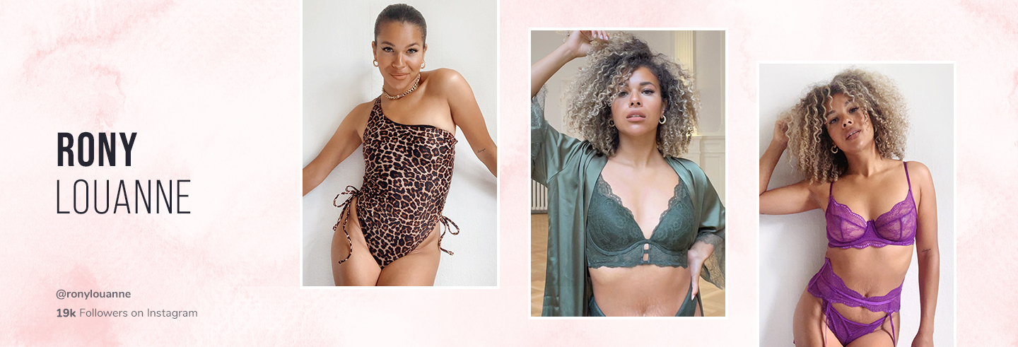 Rony adores lace and shapes that really accentuate her curves. She loves every part of her body and she is not afraid to show it. She wants to actually encourage other women to do so too. She likes Hunkemöller because its for every woman: every type of skin, size and bodyshape.
