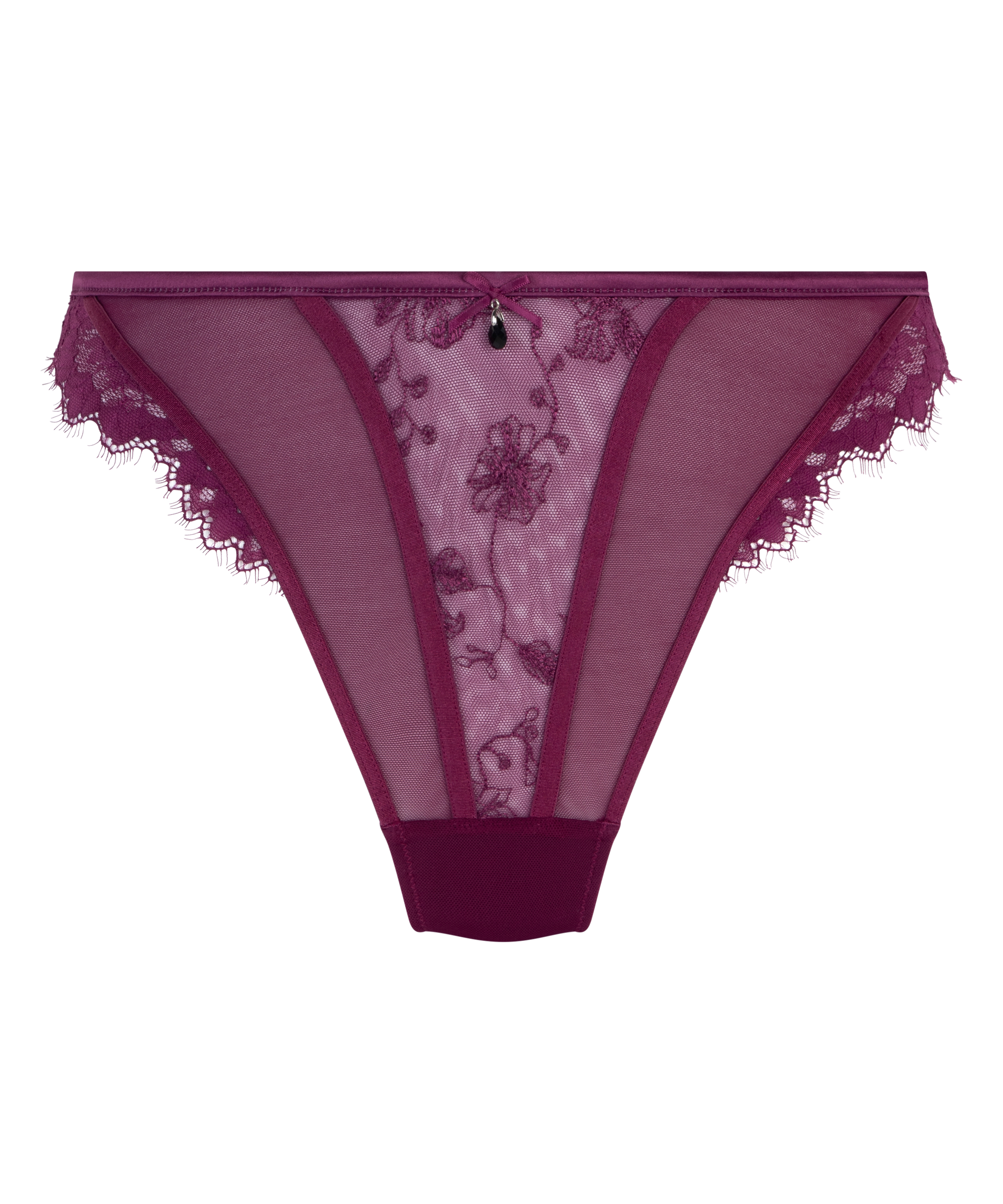 Savor the luxuriously delicate feel of this superfine embroidered mesh thong! Floral-inspired designs swirl along the front and back, adding movement and flattering definition. With a delicate cute bow and little decorative stone to finish this beautifully designed thong. Wear it with the matching Sia bra or bustier for a stunning completed look!