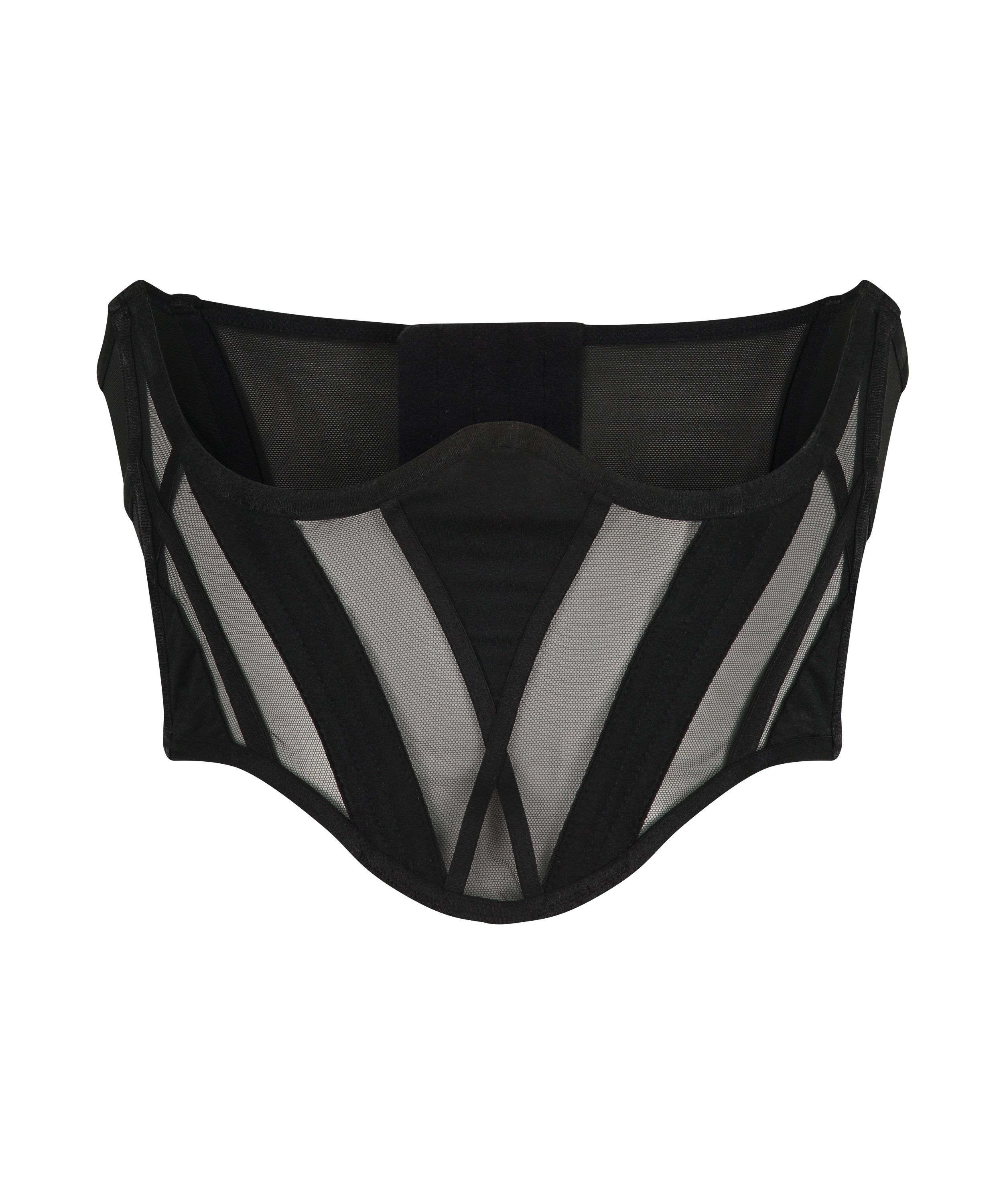 Feel empowering in this bustier! It is all sheer with a V sinching design in the front for a sculpting look. Style this cropped look in any way you want and spread positivity!