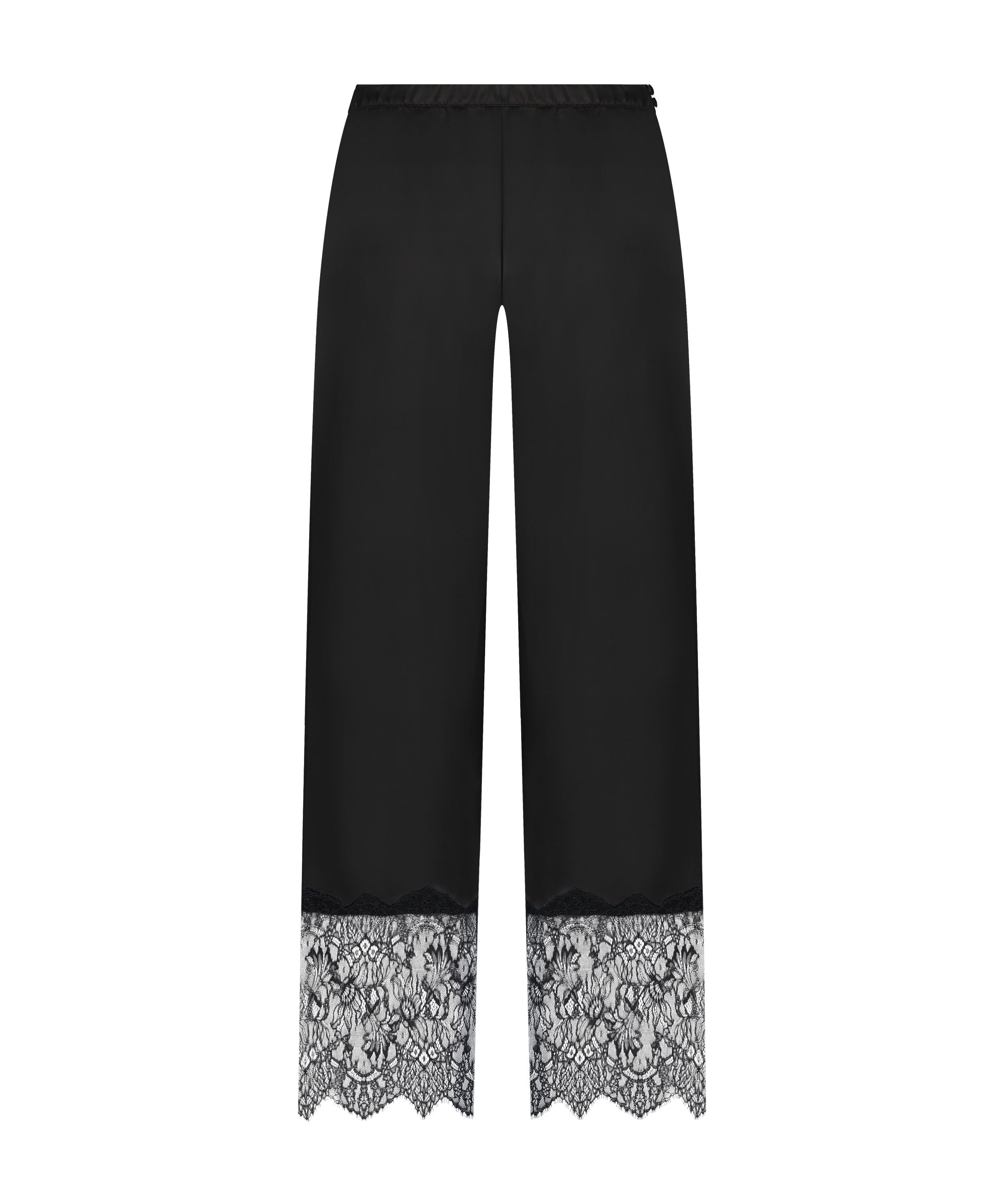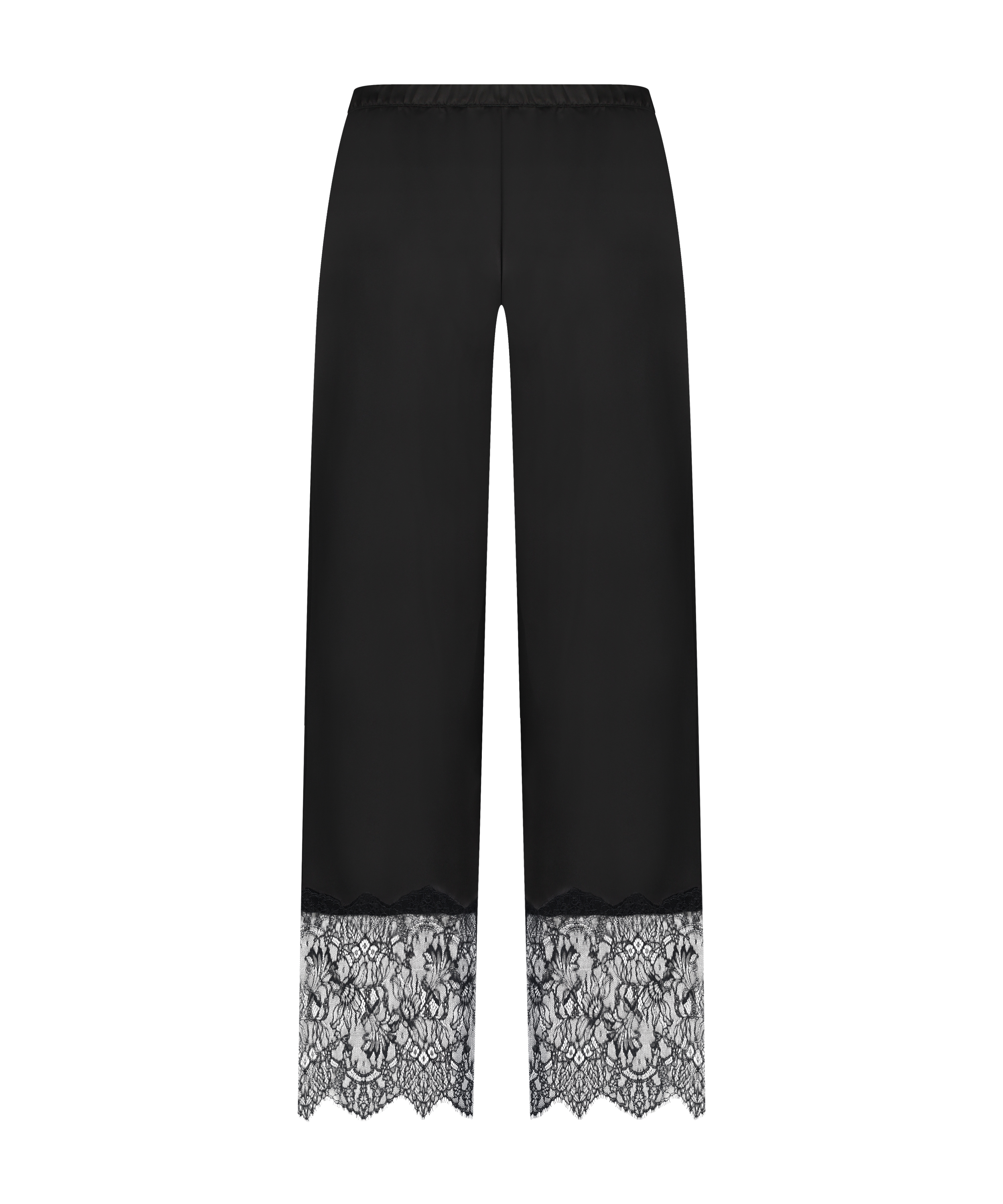 Take cozy evenings to a new level with these super nice pants. Made from a super soft and flowy satin fabric, and a wide leg look to make you feel comfortable. It is decorated with romantic lace on the lower part. Match these beautiful pants with the matching cami top and kimono!