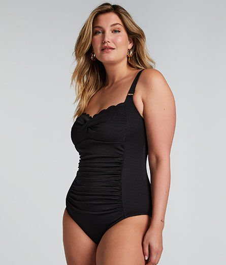 Wear a bathing suit if you feel insecure about your tummy. Nowadays it’s a fashion item so you have plenty of choices. Tip: chose a model with pleads to create a clear waist line. These bathing suits will show off your figure. - Underwire bikini with halter or thicker straps