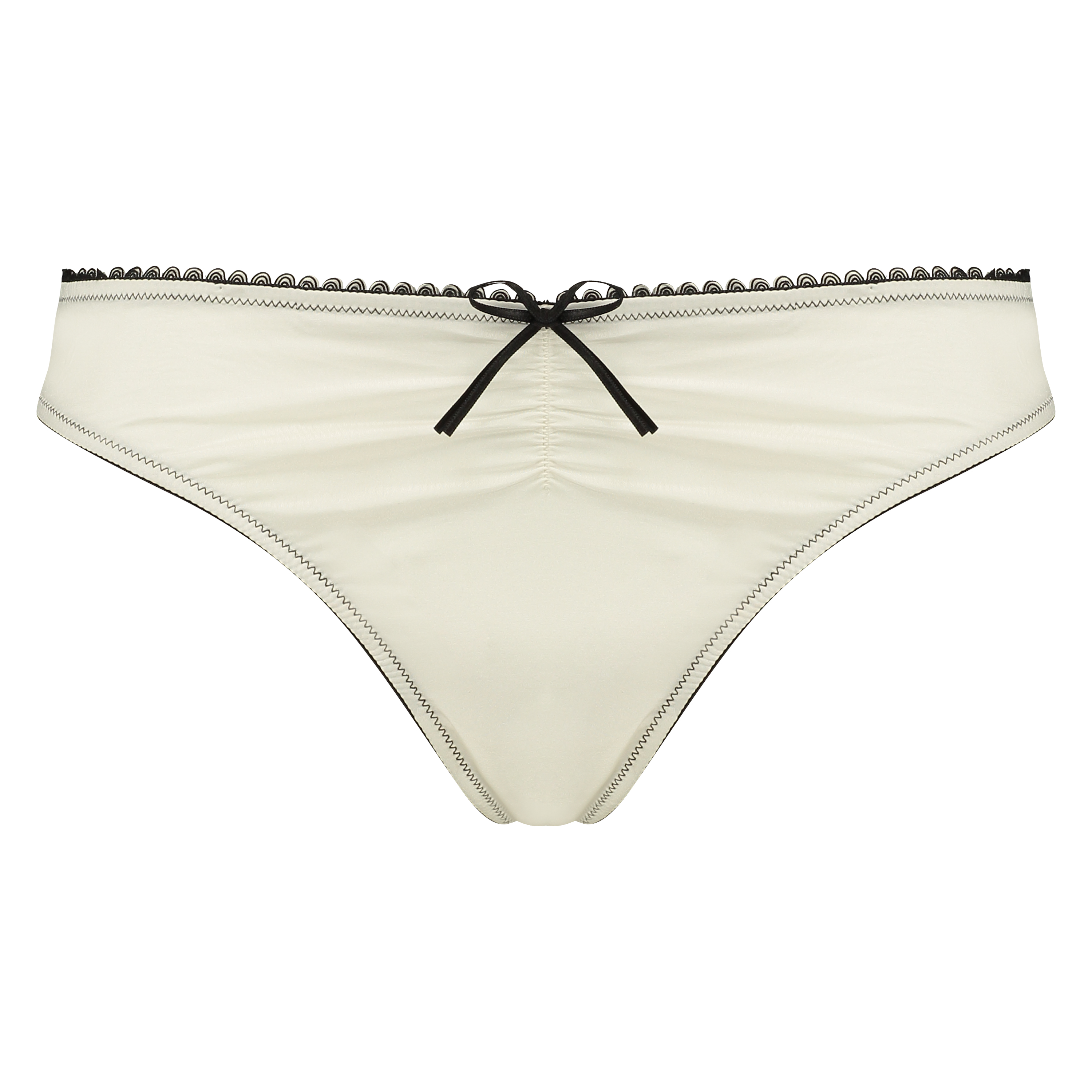 Go for a stylish look with this thong made from shiny material with pleating on the front. A sweet bow on the front adds a finishing touch.