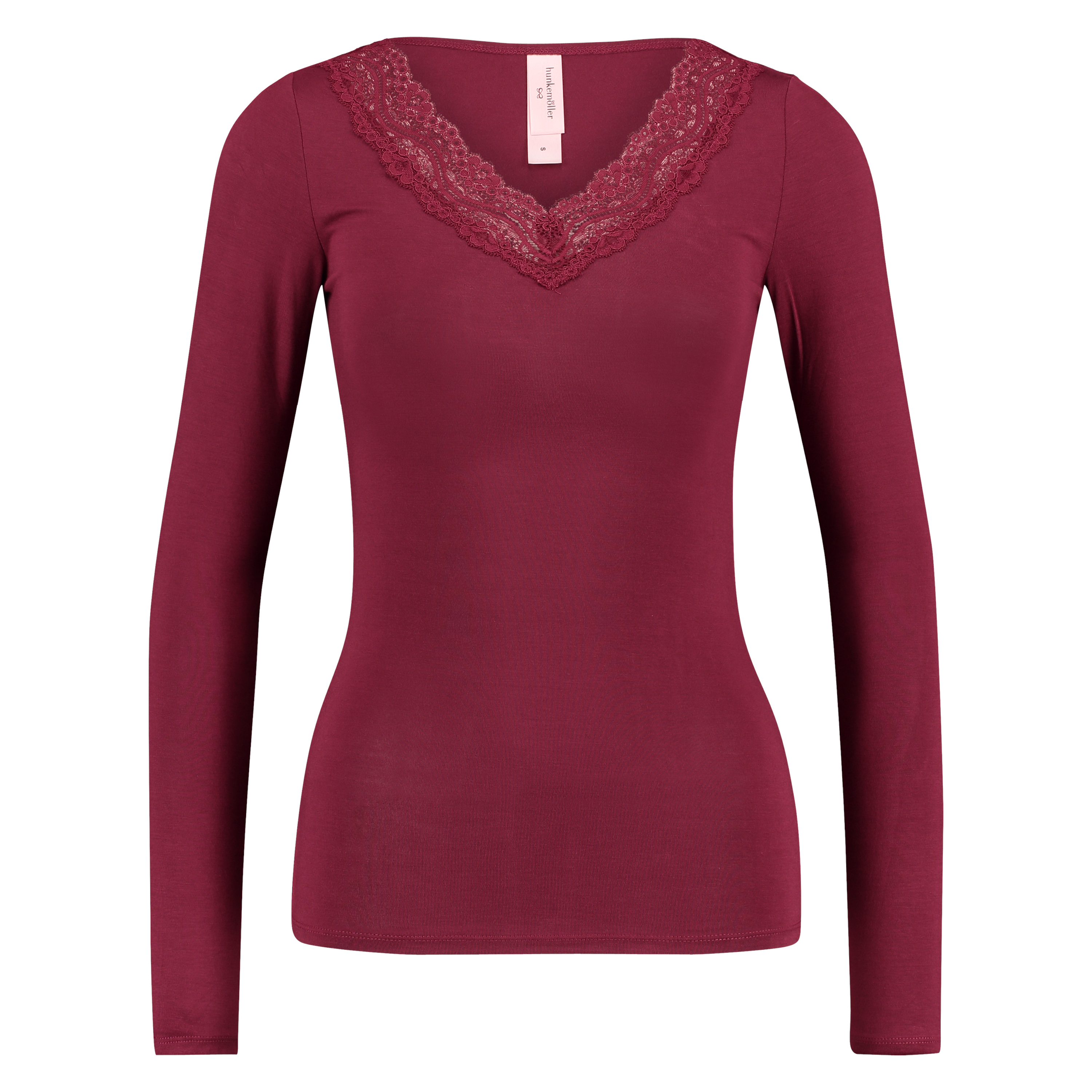 A comfortable top in supple fabric suitable for wearing at home or for outdoor activities. The top has a v-neck and lace piping.