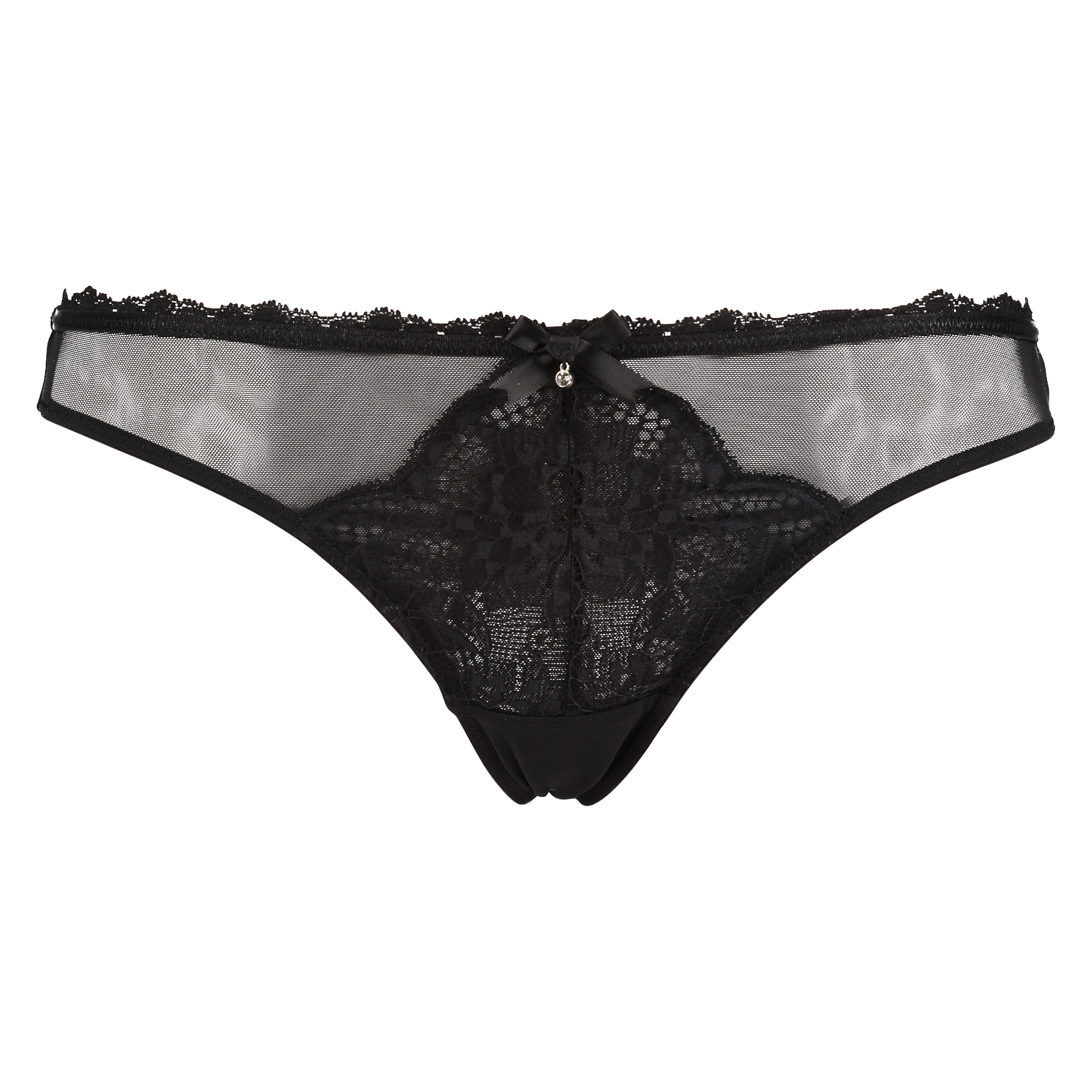 This sexy thong has semi-transparent fabric on the front with a lace pattern and is finished on the front with a small bow and a glittering diamante.