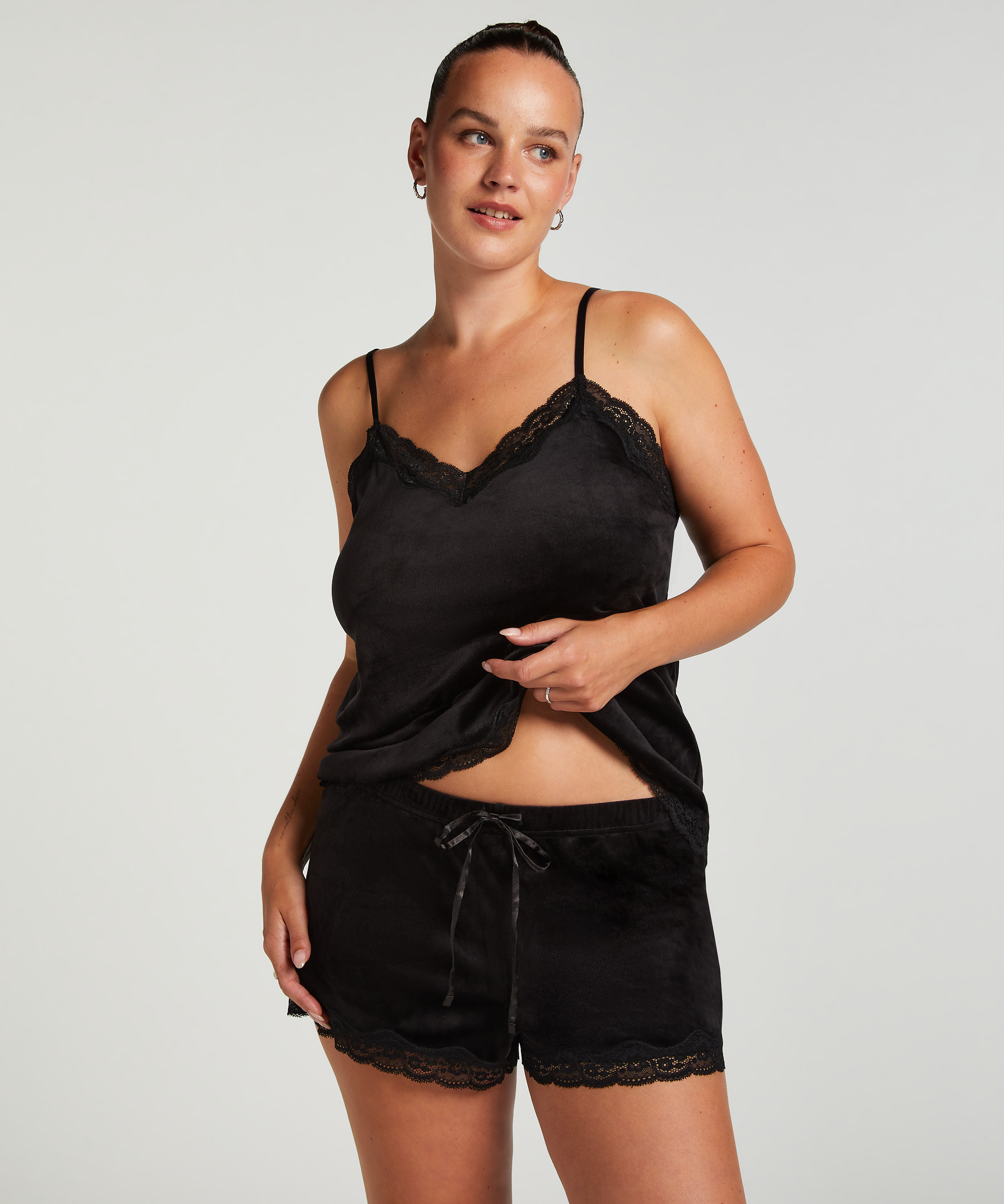 Feel super sexy and feminine with this soft top! The top is made of a velvet fabric and is finished with lace. Combine with matching items.