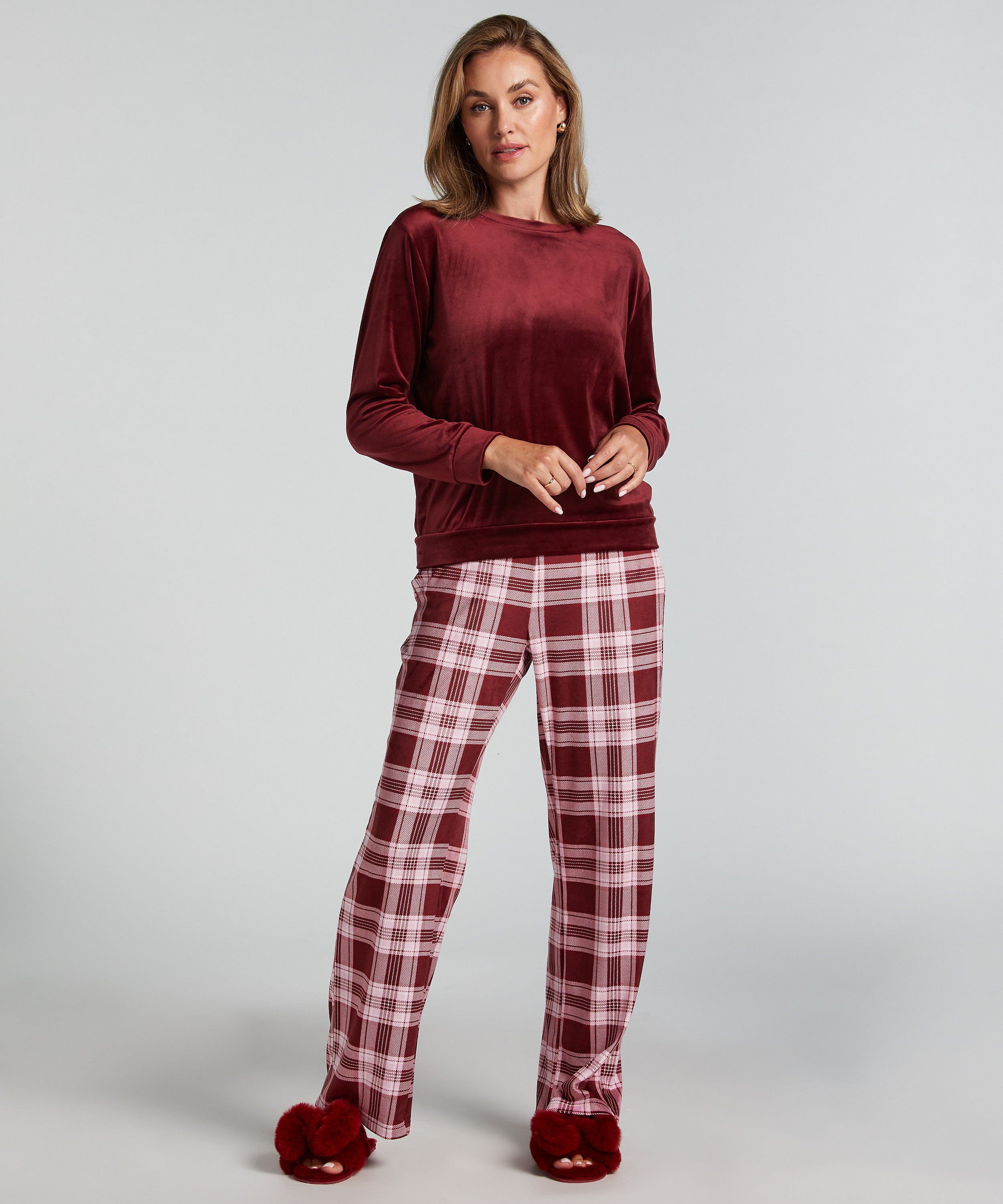 Get set for the evening ahead in one fell swoop with this fun pyjama set! The pyjama top is long-sleeved and round necked. The long wide trousers are elasticated at the waist. Ideal!
