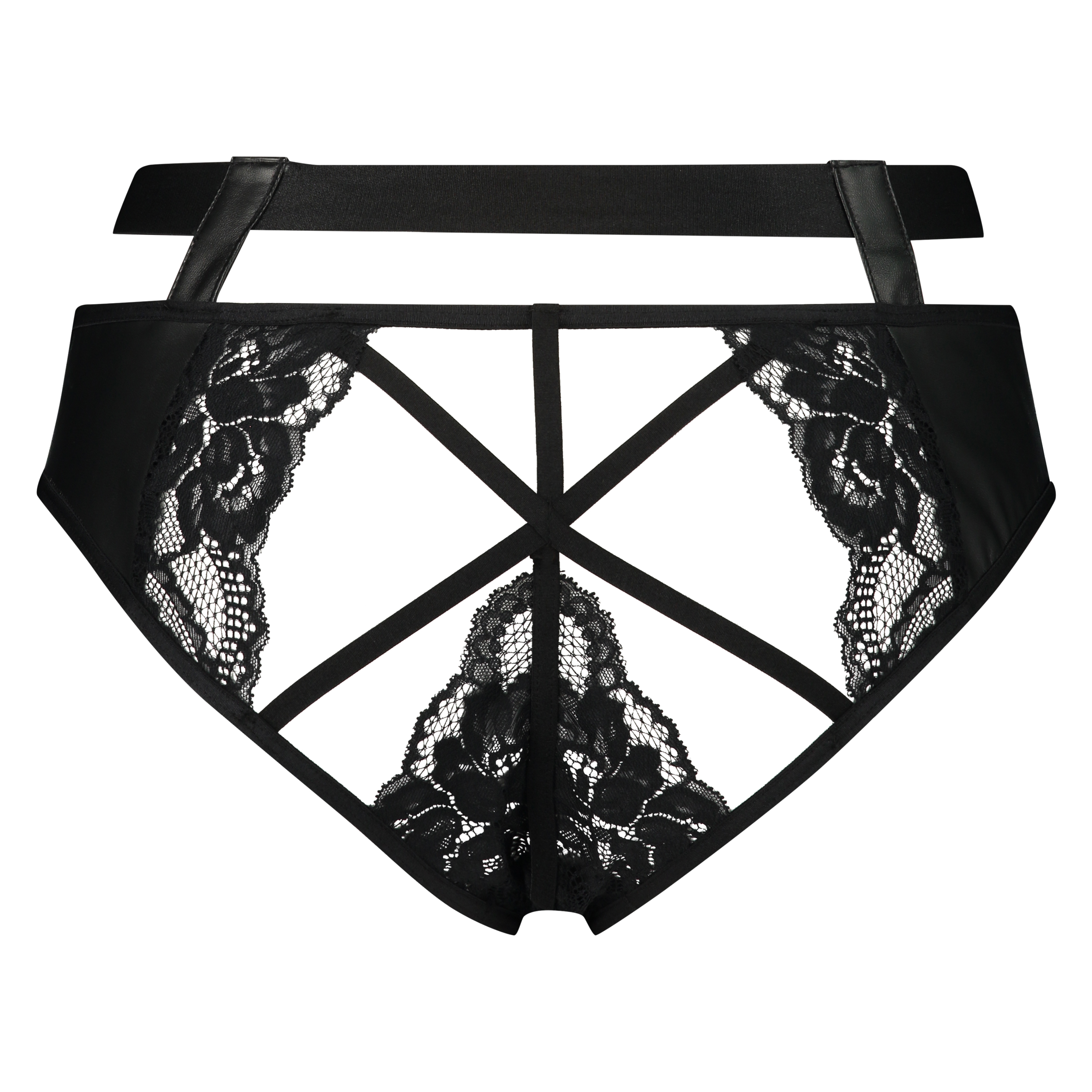 Feel super sexy in this Brazilian! The brazilian is finished with lace and leather detailing! It has an open crotch and a cheeky cut-out detail at the front. The strap at the top is finished with studs. Combine it with a matching bra for a complete set! Part of the Private Collection.