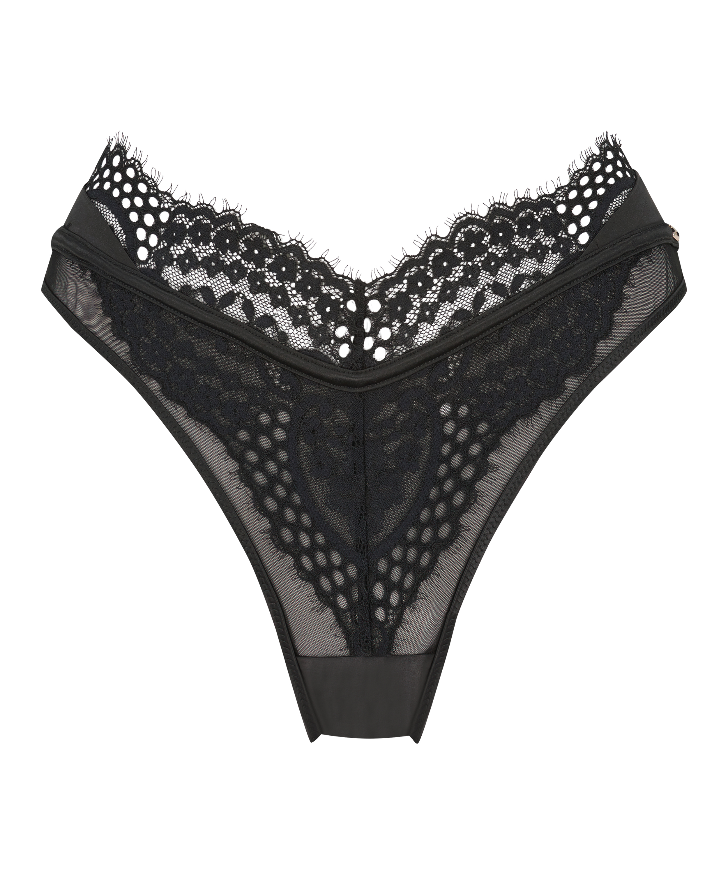 Feel confident in this high leg brazilian! The brazilian has lace and mesh details and is finished with beautiful satin fabric. Combine with the matching bra for a complete lingerie set! Part of the Noir collection.
