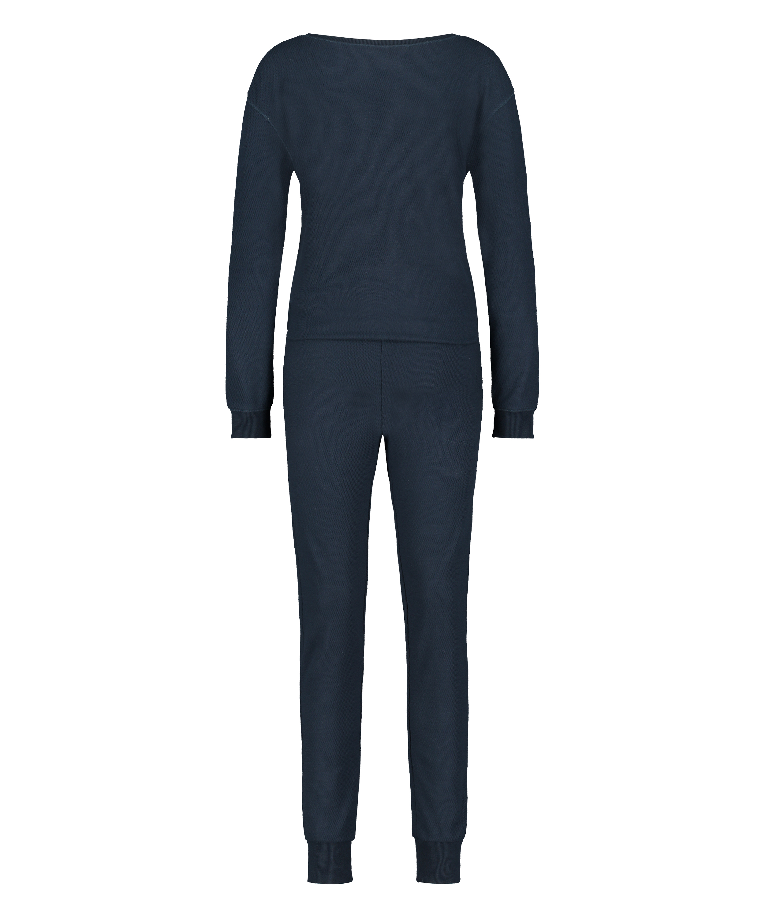 This pyjama set consists of a top and pants. The pyjama top has long sleeves with elasticated cuffs and a round neck. The pants have an elasticated waist and elasticated ankles.
