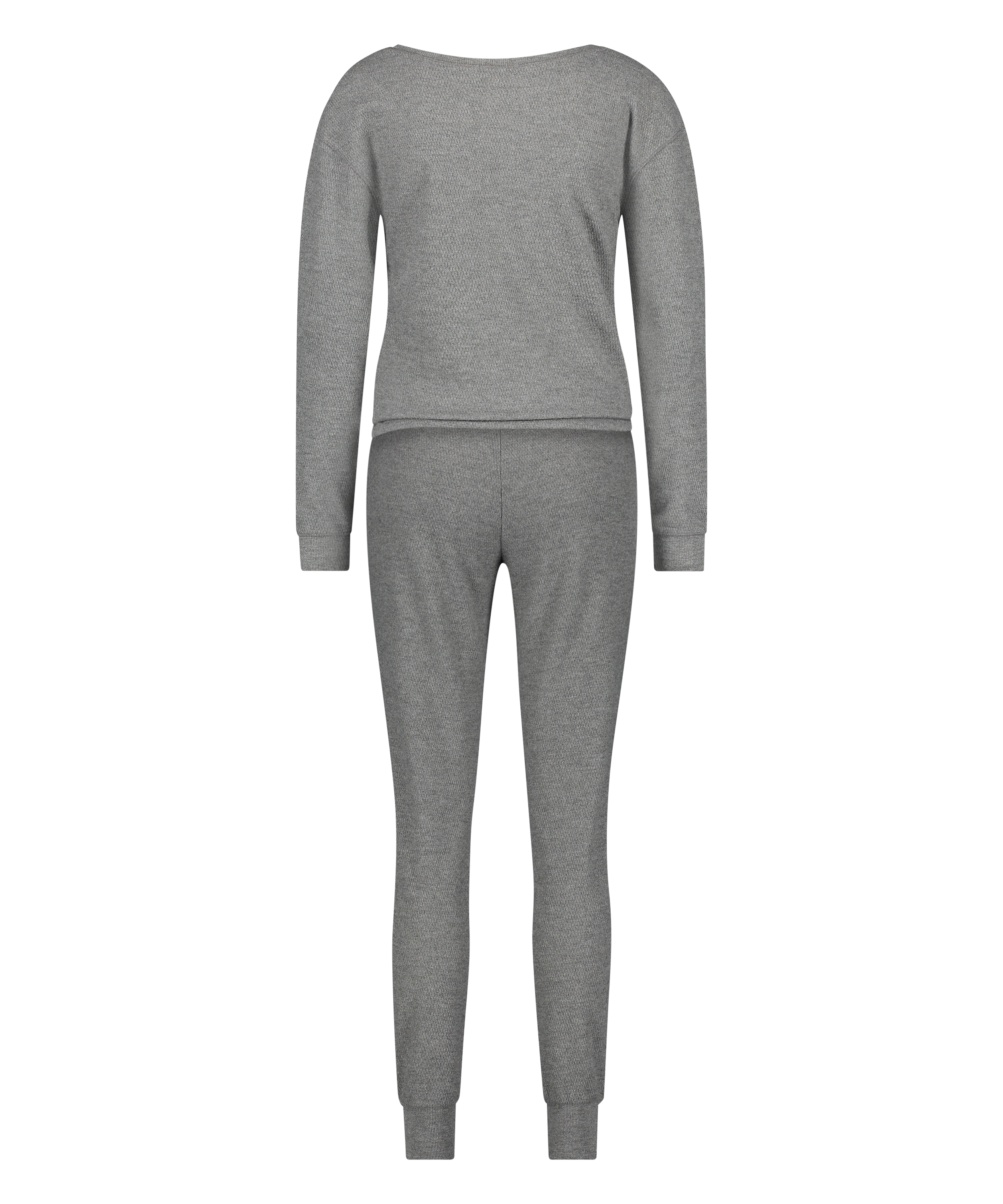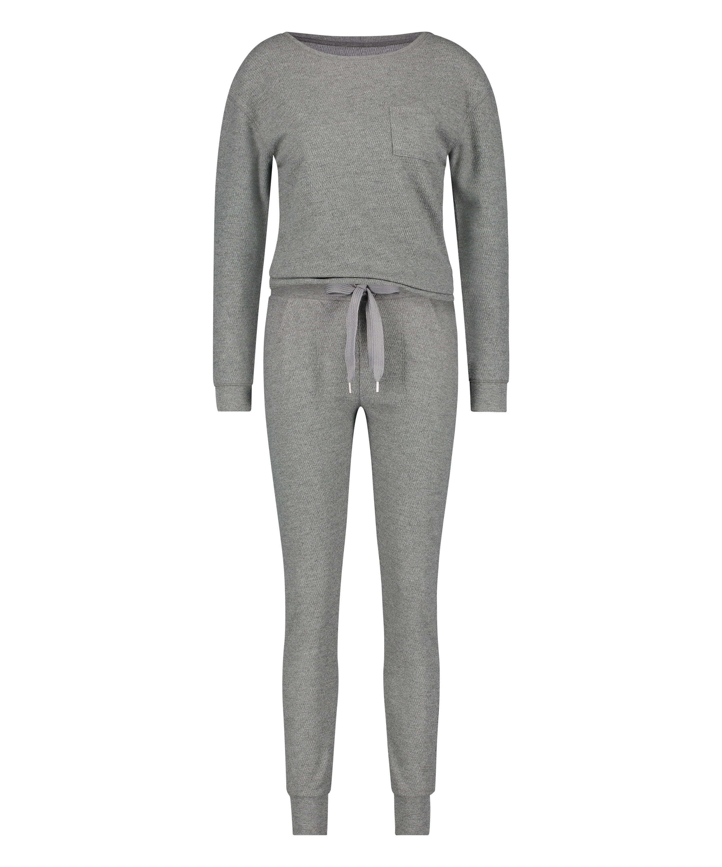 This pyjama set consists of a top and pants. The pyjama top has long sleeves with elasticated cuffs and a round neck. The pants have an elasticated waist and elasticated ankles.
