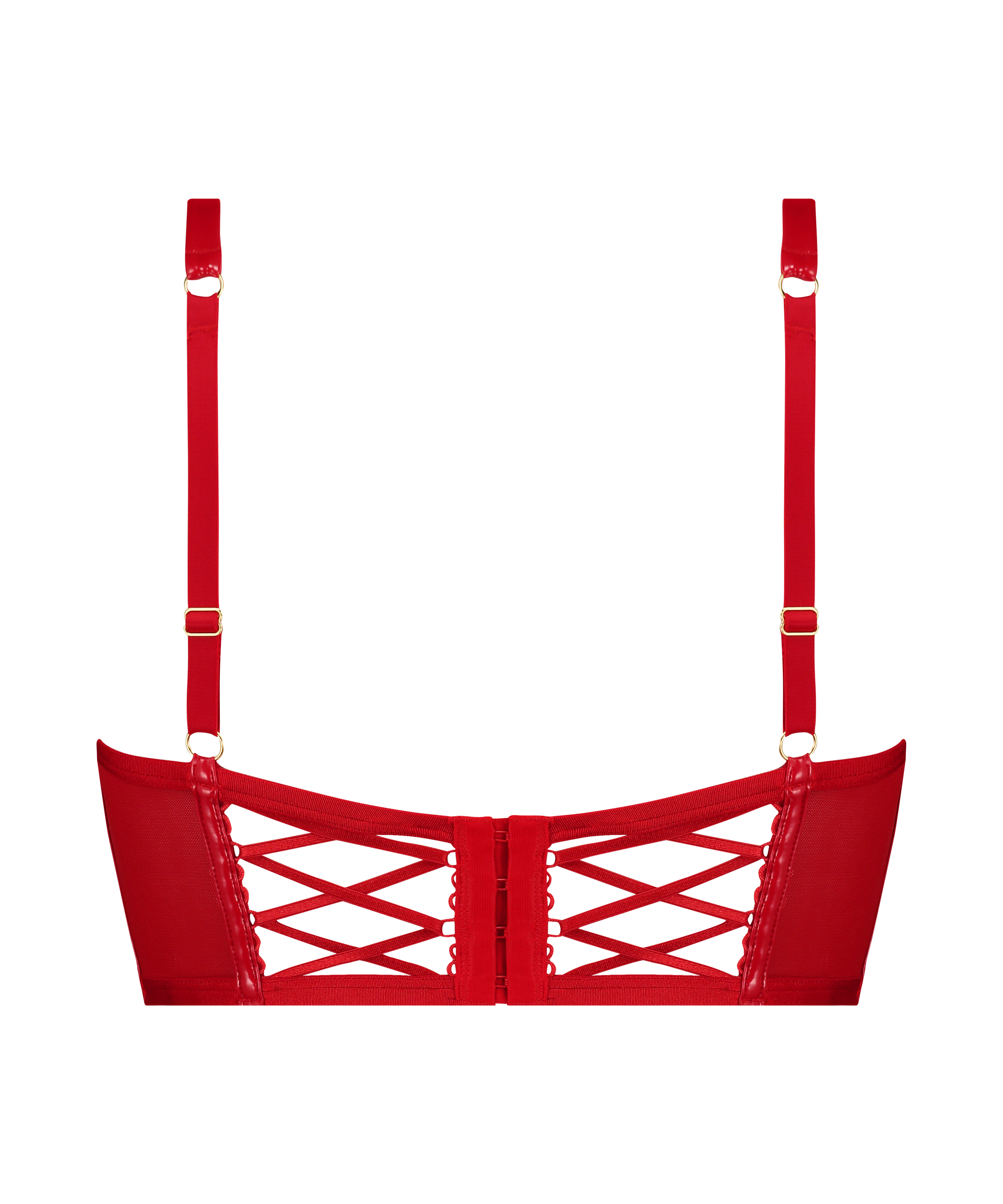 An utterly seductive bra! Featuring a glossy latex look fabric on the cups, soft side boning brings added support, whilst superfine mesh sits soft against the body with a playful lace up detail in the middle and on the back. Partly adjustable shoulder straps ensure the perfect fit. Wear with the matching Wilde thong and suspenders for a complete sassy look! Part of our Private collection.