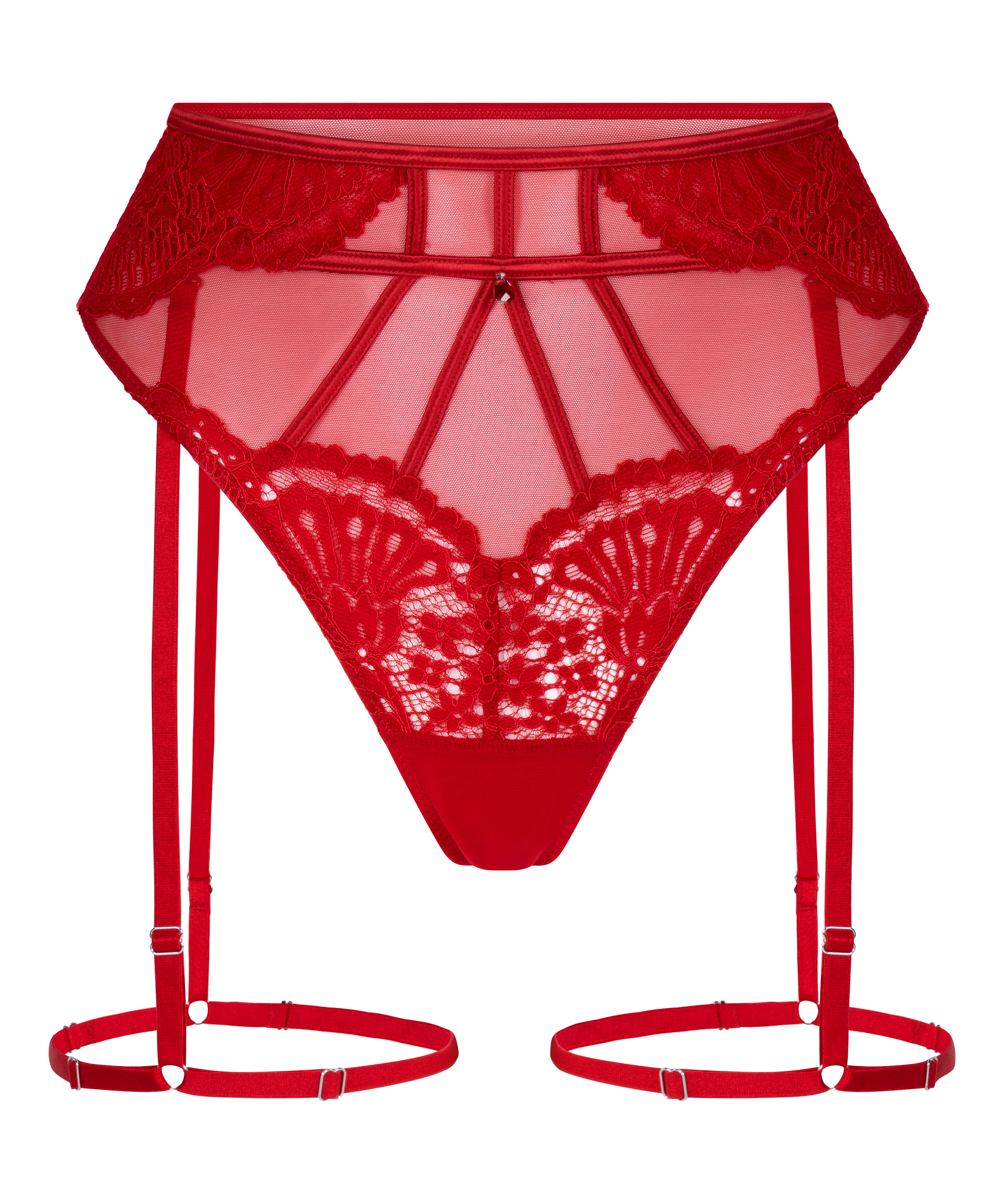 Designed to dazzle, this statement thong blends delicate textures with detailing. Made from lace and mesh panels, it offers a seductive silhouette with a luxurious feel. A sparkling jewel at the center adds a touch of glamur, while removable suspender straps give tou the fredom to style it your way. Combine with the matching bra for a complete look.