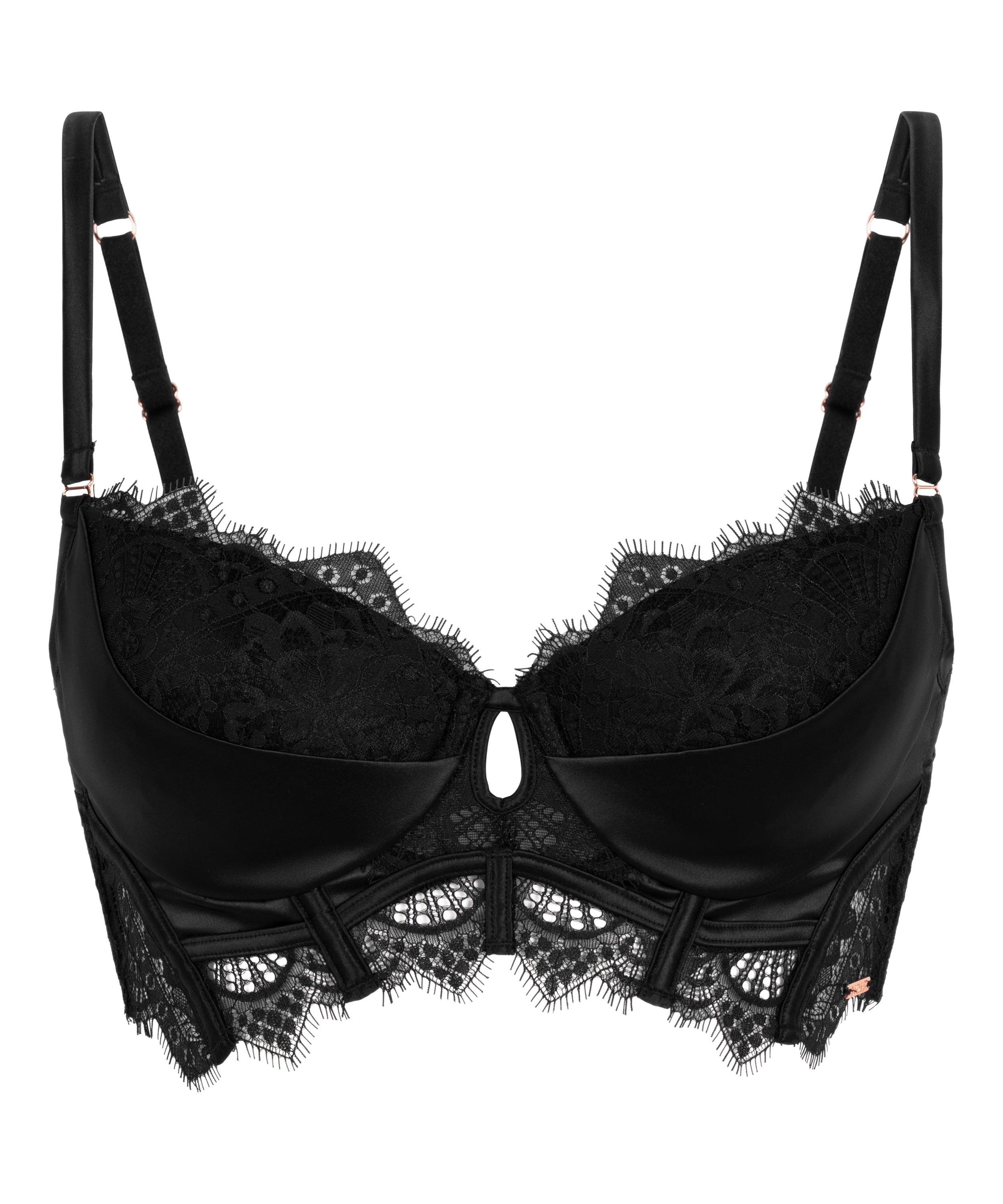 Feel super sexy with this padded underwired bra! The bra is finished with lace, mesh and satin details, giving it a luxurious look! There is also lace on the straps. Part of the Noir Collection.